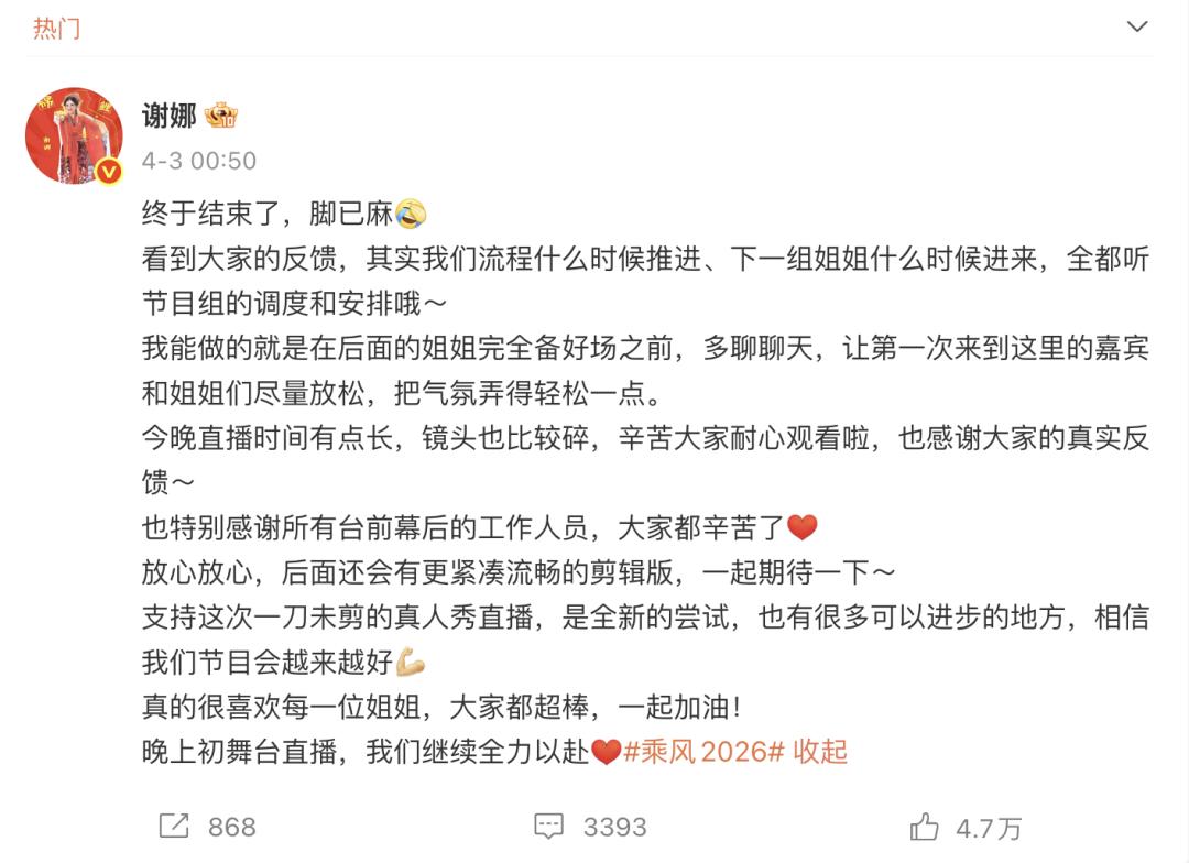 4月2日晚上,浪姐节目直播;4月3日凌晨,谢娜发微博回应——