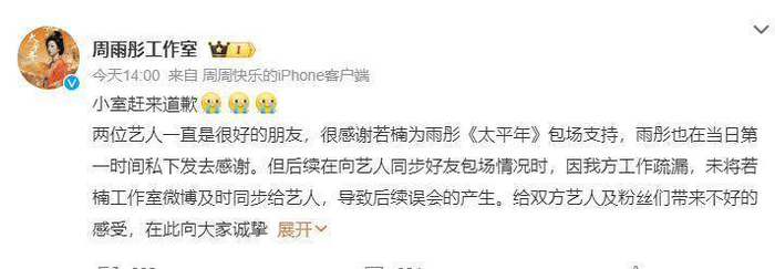 一次简单的感谢遗漏,竟然能引发这么大的风波?事情是这样的:近日,周雨彤的新剧《太平年》首播,章若楠、吴越、林允三位女星的工作室纷纷选择用云包场的方式为她打call。 章若楠工作室率先行动,下午2点钟就发布了包场微博。结果,周雨彤在公开感谢时,居然把她给漏掉了。这一失误让章若楠的粉丝炸了,他们立刻反讽:没关系,姐姐,记得给楠儿新剧包场500座还债哦!周雨彤见状赶紧跑去粉丝评论区解释,但由于没有直接回复章若楠的官博,又被批评操作失误。最后,周雨彤的工作室只好发布声明道歉,解释说是信息同步机制缺失。