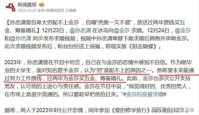 早在2025年12月底,孙丞潇就选在了冰岛钻石沙滩,单膝跪地向金莎求婚。冰天雪地里,两人相拥深吻,彻底打破了“只是玩玩”的流言。