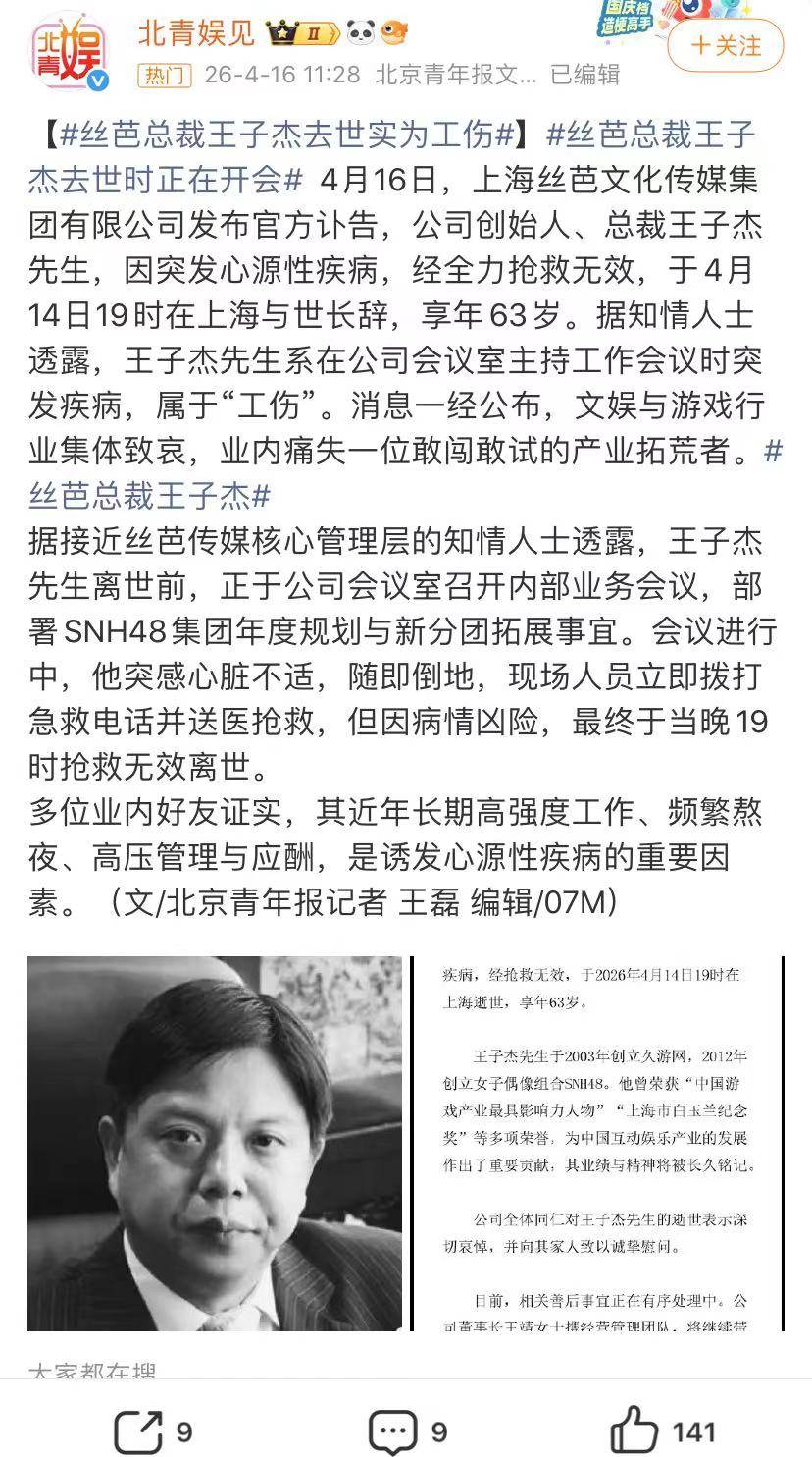 业内好友也证实,王子杰近年高强度工作、频繁熬夜、高压管理与应酬,是诱发心源性疾病的重要原因。