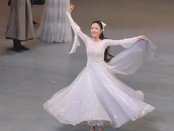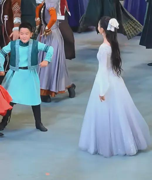 这天佟丽娅一身白色长裙如雪山仙子,她谢幕时其他表演人员站在两侧,谢幕完之后从两边忽然跑出两个小孩,一人牵着佟丽娅的一只手。左边的红衣小女孩是董璇的女儿小酒窝,右边的蓝衣小男孩则是佟丽娅的儿子朵朵。