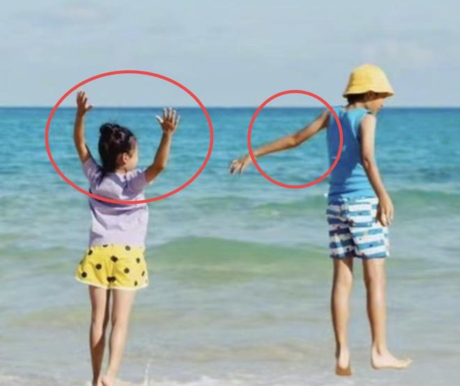 暑假到了,孙俪和邓超带着孩子们去海边玩。合影从左到右依次是邓超、小花、等等、孙俪,邓超跳得最高,一只手冲向天空,双腿弯曲,被网友吐槽:像一只猴子。