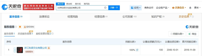 天眼查App显示,何润东经纪公司北京和颂文化经纪有限公司成立于2018年11月,法定代表人为李冬雪,注册资本100万人民币,经营范围包括文化娱乐经纪人服务、演出经纪、营业性演出等,由浙江和颂文化有限公司全资持股。