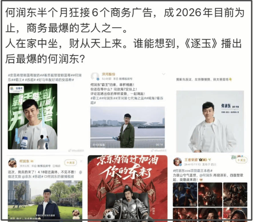 有网友统计,何润东因为这次的翻红,半个月内就拿下6个商务广告,虽然似乎是借热度的短期代言,但这个速度内娱也很少有人能做到了。
