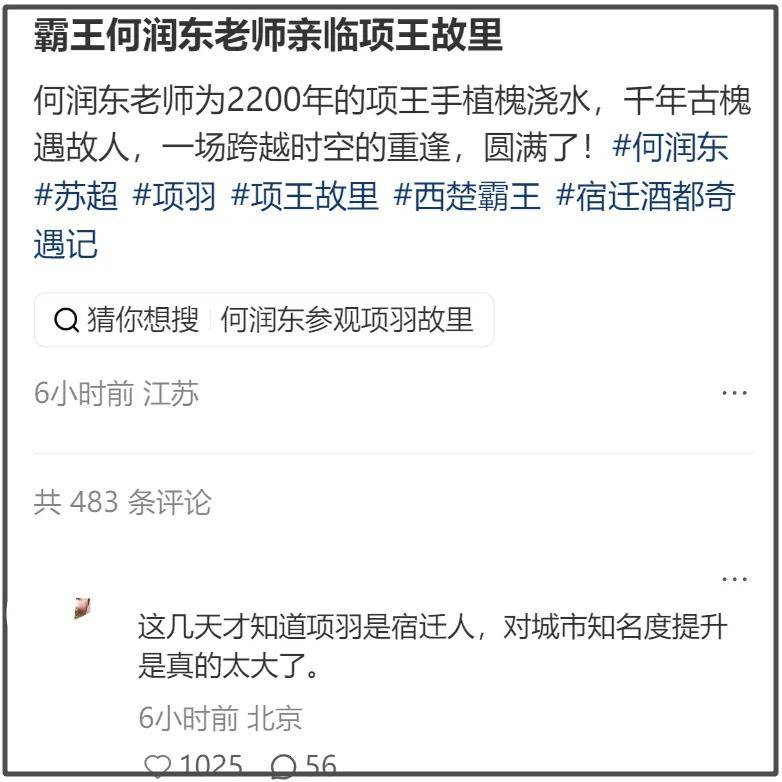 何润东和文旅的联动,除了亮相苏超之外,还去参观了项羽故居,给当地的旅游景点做了宣传。