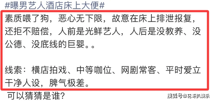 Q女士给出了几个关键线索:男性、经常在横店拍戏、网剧常客、平时爱立干净人设、中等咖位。哪个干净人能干出这种事啊?这种人是怎么立爱干净人设的?人生如戏全靠演技吗?虽然不知道这个男明星是谁,但是想到一个平时在镜头前光鲜亮丽、一尘不染的艺人,背地里却做出如此肮脏且毫无底线的行为,也是够令人作呕的,也不知道这个明星的粉丝如果知道了会作何感想。