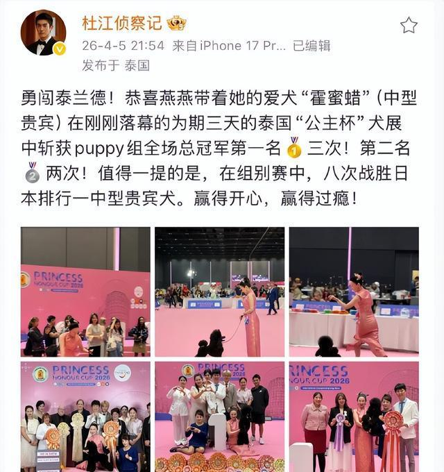 近日,“半隐退”近五年的霍思燕以一种意想不到的方式强势回归。原来她早已走上一条新路。45岁的霍思燕凭借实力出圈,再破天花板。4月5日,杜江发文庆祝霍思燕和她的爱犬“霍蜜蜡”。他们在清明假期中参加了泰国公主杯犬展。“霍蜜蜡”一举拿下全场总冠军,八次击败日本排名第一的同品种犬,创下中国选手在该赛事的历史最佳成绩。这样的辉煌战绩令人振奋。