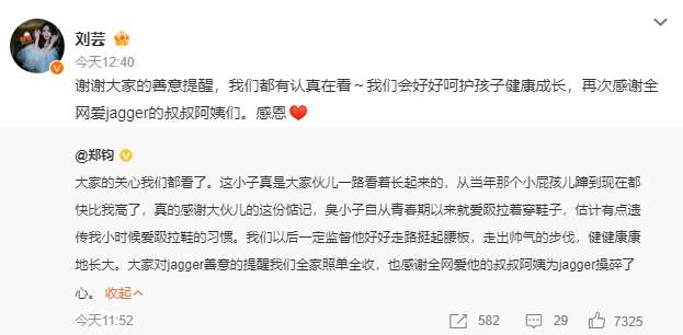 搜狐娱乐讯 11日,刘芸与老公郑钧纷纷在社交平台上发文回应儿子走路内八一事!刘芸表示:“谢谢大家的善意提醒,我们都有认真在看~我们会好好呵护孩子健康成长,再次感谢全网爱jagger的叔叔阿姨们。感恩。”