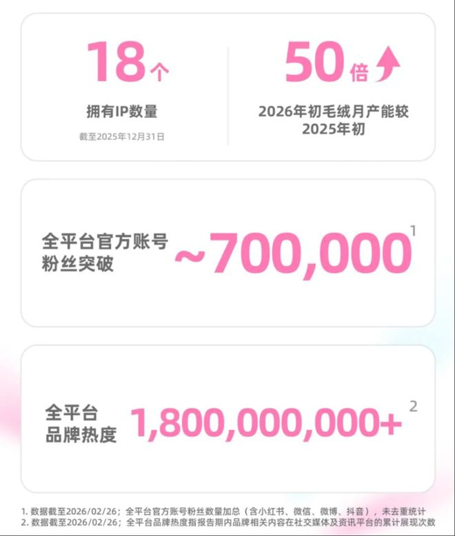 HERE奇梦岛在这方面并非没有遇到过挑战。早期,其爆款IP也曾面临产能爬坡的烦恼。但根据其财报披露,公司的应对速度堪称迅猛。2025年8月,其毛绒盲盒单月产量就突破了100万件,较年初增长超过20倍;而到了2026年初,HERE奇梦岛的毛绒月产能已经较2025年初增长了50倍。
