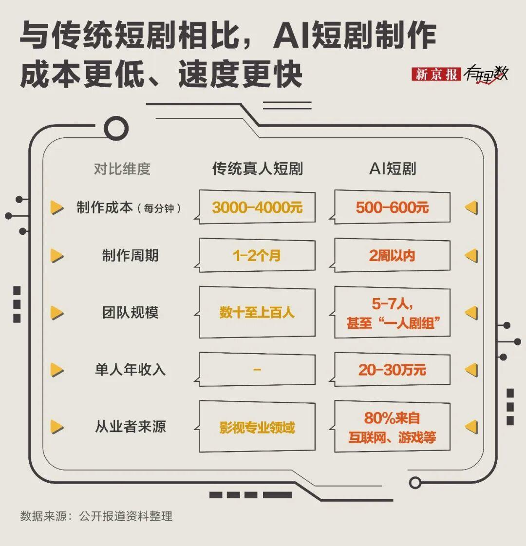 AI还彻底重构了创作团队:“过去需要数十上百人协作,如今5—7人小工作室即可全包,甚至出现“一人剧组”——靠着“一台电脑、几款AI软件”,一人一年能挣二三十万元。