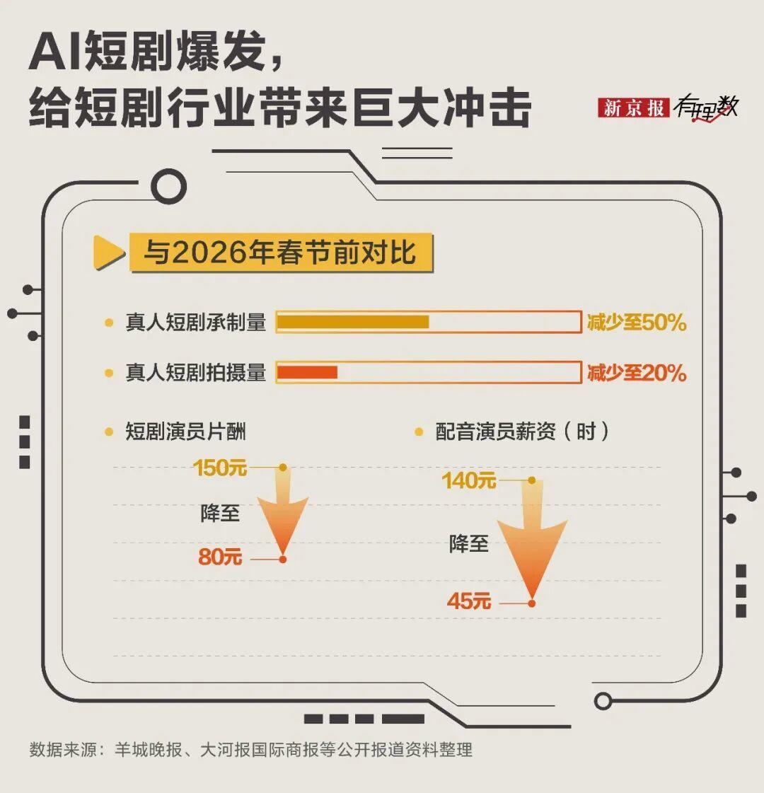 援引羊城晚报数据,今年春节后真人短剧的承制量直接腰斩了50%,曾经靠体力和技艺吃饭的片场人,正被AI快速替代。