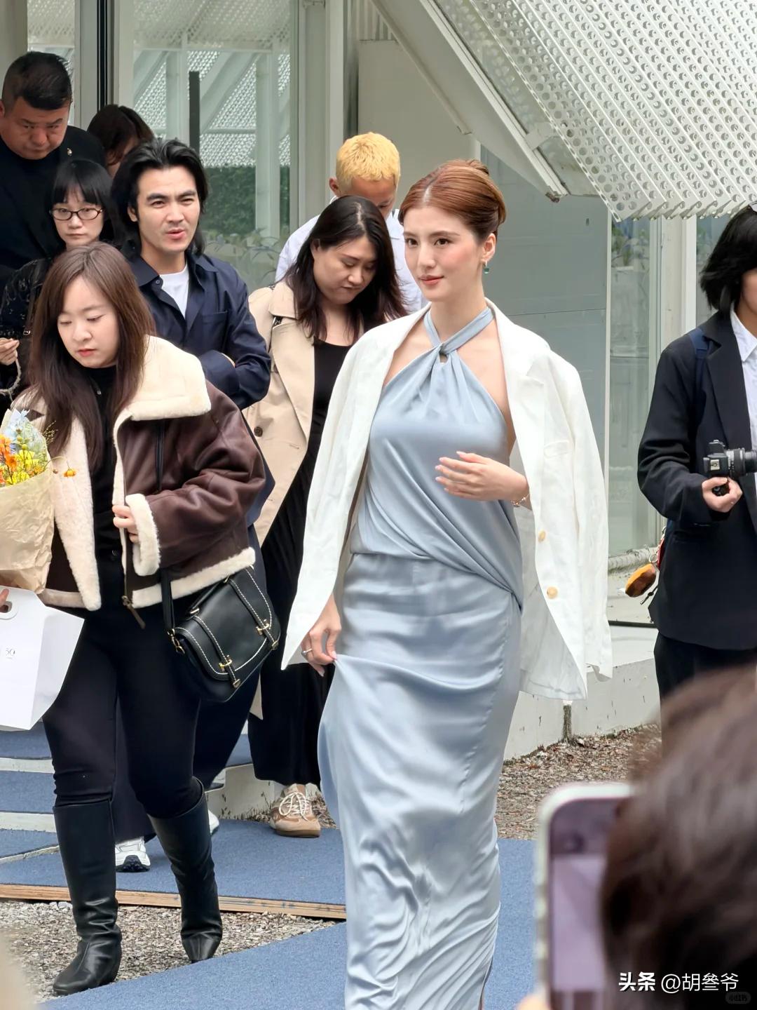 从网友晒出的生图来看,吴千语当天造型确实用心,蓝色挂脖拖尾丝绸裙,面料自带光泽感,挂脖设计露出精致锁骨,拖尾裙摆走起来自带氛围感。