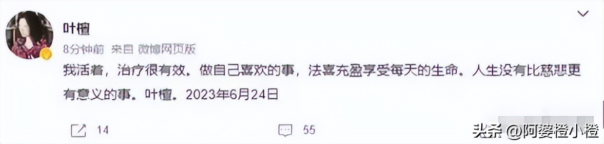 这个消息迅速在网上发酵,引发无数人的关注与担忧,然而当天中午,叶檀本人就在微博发文辟谣:“我活着,治疗很有效。做自己喜欢的事,法喜充盈享受每天的生命,人生没有比慈悲更有意义的事。”