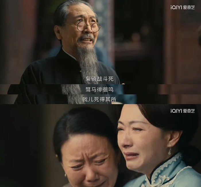 张汝贤(毕彦君 饰)得知儿子张云魁(王阳 饰)的“死讯”时仰天悲鸣,儿媳丁玉娇(万茜 饰)在一旁泪流满面却隐忍克制。战争让这个饱读诗书的家庭遭逢巨变,而亲人之间的血脉相连与民族大义交织在一起,让这种情绪极具感染力。