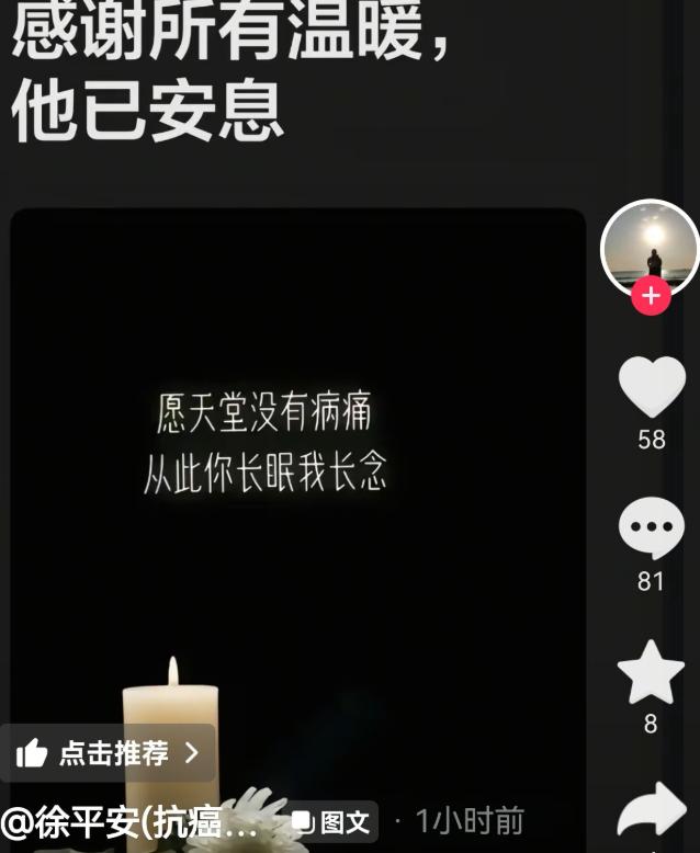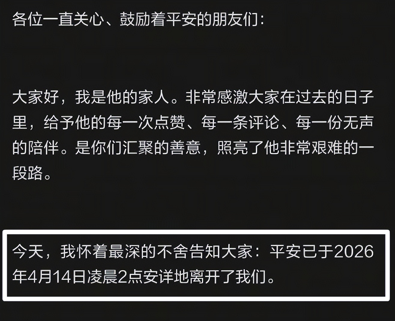 随后公开的一封致网友的信,更精准定格了徐平安生命的终点——4月14日凌晨2点,在医护团队的全力救治、家属的日夜陪伴,以及他本人拼尽全力的坚持下,徐平安最终安详离去,没有留下太多遗憾,却给无数陌生人留下了满屏的泪水。