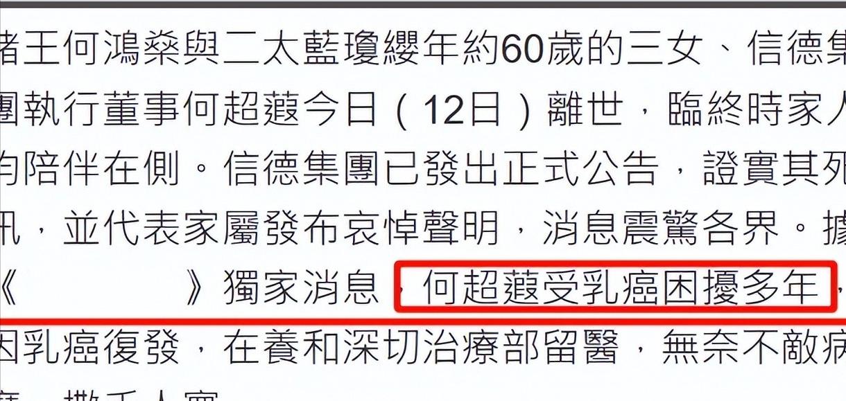 这位享年60岁的豪门千金,最终没能战胜病痛的折磨。消息传出后,何超琼、何超凤、何超仪、何猷龙四姐弟联合发布讣告,正式宣告何超蕸离世,讣告中特意提及,何超蕸临终前,家人始终陪伴在她身边,给予她最后的温暖与陪伴。