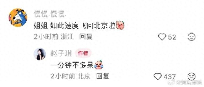 11日晚,赵子琪在自己的个人微博下回复网友说她这么快回北京的评论,直言:“一分钟不多待”。