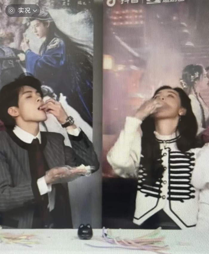 直播里最好玩的是陈都灵和曾舜晞的互动。 两个人玩了个“猴王比心”,曾舜晞刚把手举到头顶比了个猴王姿势,陈都灵一秒就接上了,默契度超高。 他们还试了反手比心,动作同步得让人迷糊。