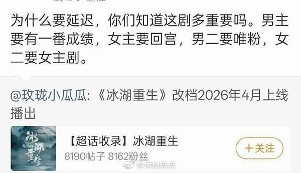 云合又跌了~冰湖重生男主是被连累的吧?其实,这部剧也不可能播的好,抛开女主那事(其实也抛不开)很难跟之前的1媲美啊!不是说一定要拿来比较毕竟他是第二部男女主都换了