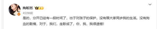3月25日中午“陶昕然何建泽疑似离婚”引热议,刚刚陶昕然发微博承认离婚: