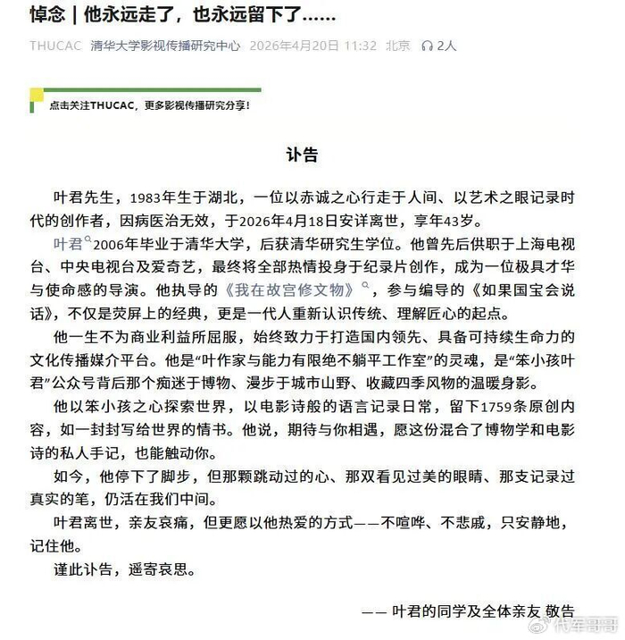 2026年4月20日,一则令人悲痛的消息传遍全网:清华大学影视传播研究中心正式发布讣告,知名纪录片导演叶君先生因病医治无效,于4月18日安详离世,年仅43岁,正值创作黄金期的他猝然离去,让整个影视圈乃至无数观众陷入深切哀悼,而其曝光的死因,更让人扼腕叹息。