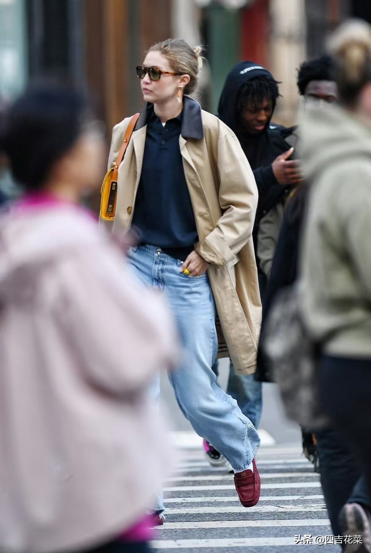 春季总离不开一件杏色的风衣,Gigi选择的是单排扣翻领的样式,比双排扣的英伦气质多一些法式风情,拼接的皮质翻领增加了一丝精致感,风衣有它粗犷的一面。