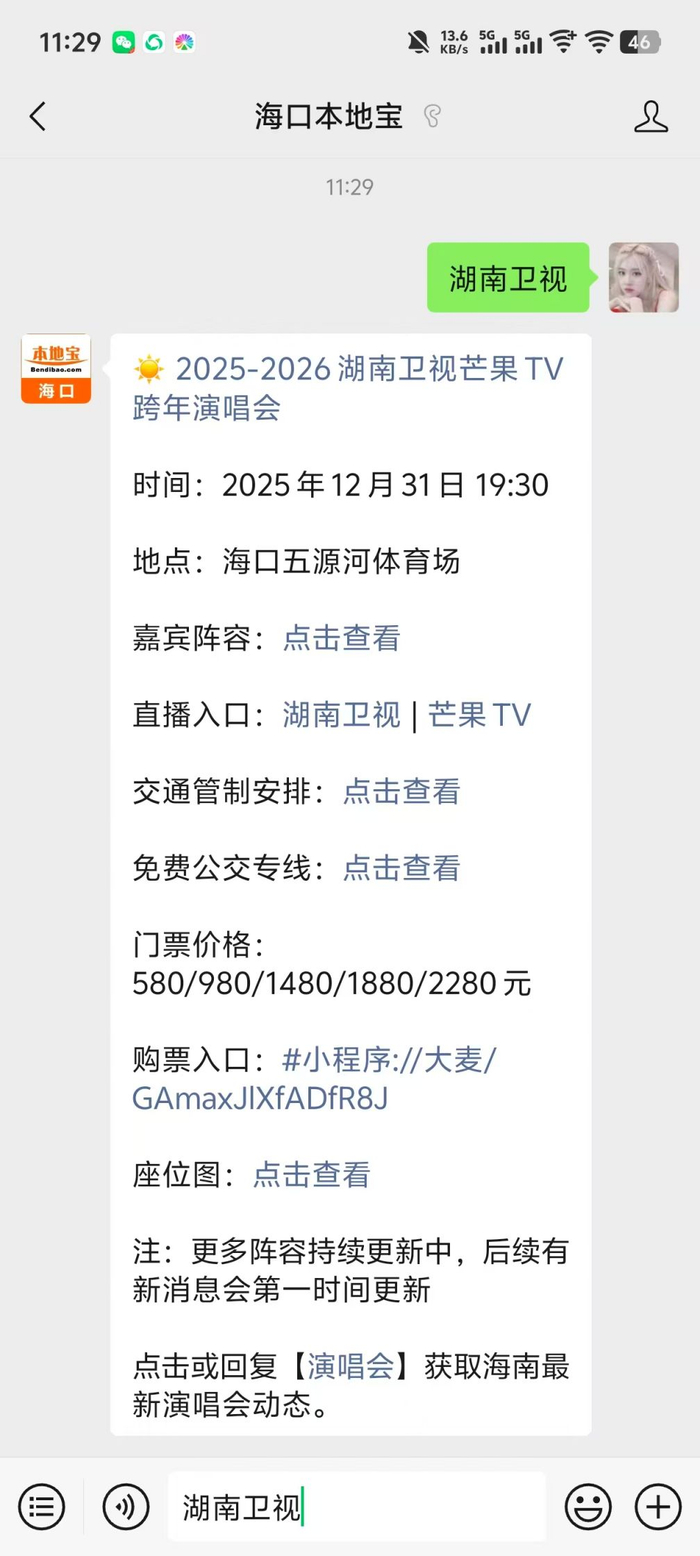 温馨提示:微信搜索公众号【海口本地宝】,关注后在对话框回复【湖南卫视】可获湖南卫视跨年晚会时间/地点,第一时间查看购票入口/时间/指南/福利,以及交通攻略/接驳车等。