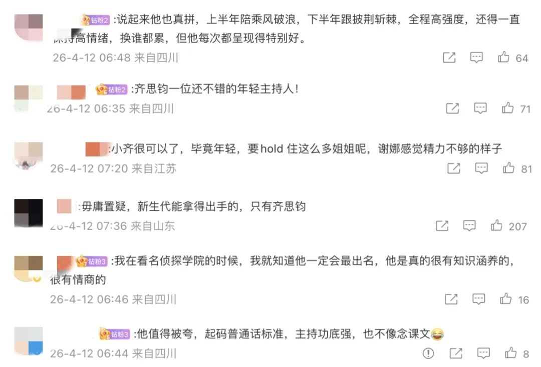 与此同时,同台的男主持齐思钧被夸了,说他一直都是一个细心又有分寸的主持人,总能第一时间察觉到姐姐们情绪变化,控场能力也很在线。