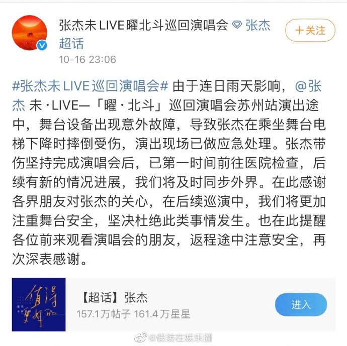 2021年10月16日,张杰在苏州演唱会遭遇重大舞台事故。升降机突发故障导致他高空坠落,腰椎横突骨裂、手指撕裂伤需缝针处理。现场视频显示,他强忍剧痛完成剩余演出,鲜血染红话筒的细节令观众动容。次日凌晨,他发布长文回应,核心集中于三点: