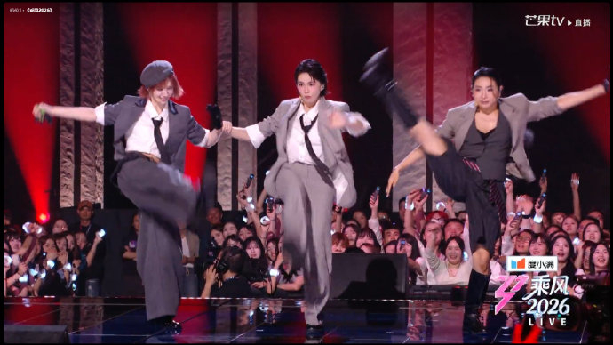 编舞采用动态中心位轮换设计(平均10秒切换一次队形),三人通过走位构建“半合半离”的视觉结构,呼应歌词中爱恨拉扯的二元矛盾。黄灿灿在轮换C位时,以报童帽搭配粉色短发的甜酷造型登场,灰色露腰西装与背带裤打造“漫画感少年气”,被观众称为“老公姐风格”。