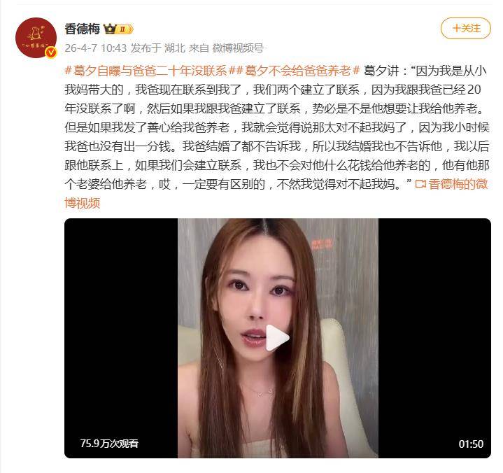 “因为我从小是我妈带大的。”一句话,揭开了葛夕与父亲之间长达二十年的情感与责任裂痕。据网友4月7日爆料,近日,她在社交媒体上自曝与父亲断绝联系二十年,并明确表示不会为其养老,这番“断绝关系”的宣言迅速引发热议。