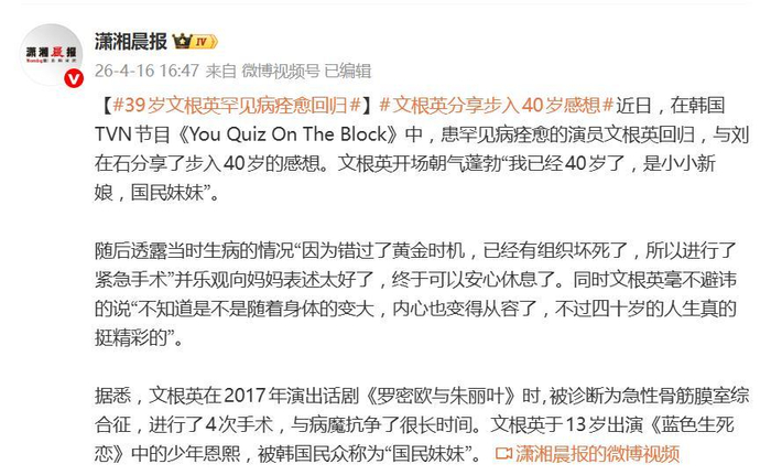 如今,彻底痊愈并迈入四十岁门槛的文根英,对人生有了更深的体会。她毫不避讳地分享了自己的变化:“不知道是不是随着身体的变大,内心也变得从容了。” 她坦言,四十岁的人生“真的挺精彩的”,甚至用“令人兴奋”来形容此刻的状态。从13岁因《蓝色生死恋》中的少年恩熙一角成为全韩国民众疼爱的“国民妹妹”,到历经生死病痛后从容豁达的四十岁演员,文根英的成长轨迹,仿佛一场真实的“人生励志剧”。