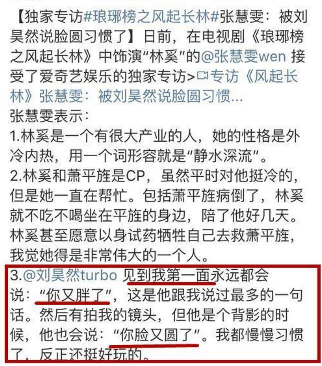 而且在片场刘昊然也经常调侃张慧雯的体重,说镜头都把张慧雯的脸都拍小了。