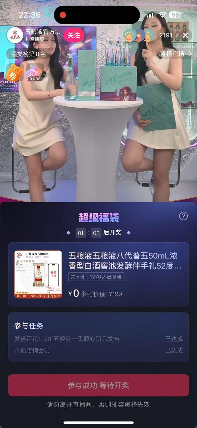 在介绍新品时,主播多次强调,首批次礼盒装均附有邓紫棋形象腰封,100ml小瓶装为限量款,瞬间点燃“棋士们”(邓紫棋粉丝昵称)的收藏热情。五粮液还在直播间大放福利,每15分钟进行一次抽奖,送出5瓶价值199元的八代普五50ml伴手礼。