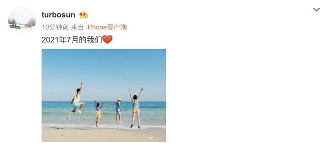7月16日,孙俪发文:2021年7月的我们。并晒出一家四口度假照,四个人站在海滩上跳跃,画面温馨。