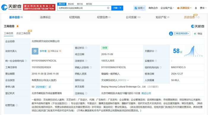 天眼查App显示,何润东经纪公司北京和颂文化经纪有限公司成立于2018年11月,法定代表人为李冬雪,注册资本100万人民币,经营范围包括文化娱乐经纪人服务、演出经纪、营业性演出等,由浙江和颂文化有限公司全资持股。