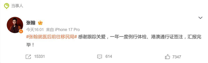 4月21日,演员张翰的一条微博回应,给一场刚冒头的八卦猜测迅速画上了句号。面对被拍到前往移民局引发的“计划移民”传闻,张翰火速发文:“感谢跟踪关爱,一年一度例行体检、港澳通行证签注,汇报完毕!” 干脆利落的澄清,让一场因名称误解引发的乌龙浮出水面。