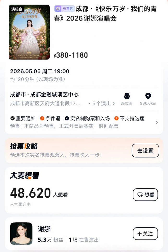 记者注意到,谢娜个人演唱会成都站截至发稿时想看人数已超4.8万,票价380元至1180元不等。据悉,谢娜曾在2月的直播中表示:“我那些歌也要拿出来见人了。”