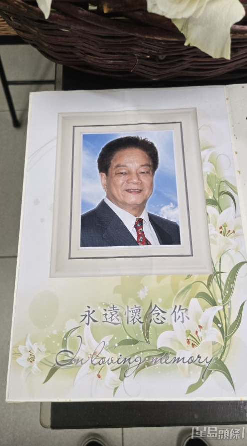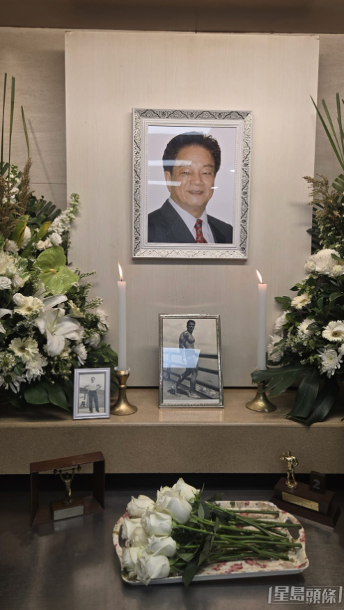 灵堂内摆放的两张照片格外引人注目,一张是郑雷身穿黑色西装、系着红色领带的遗照,神情温和慈祥,尽显长者风范;另一张则是他年轻时赤裸上身的照片,肌肉线条饱满紧实,依稀可见其当年作为健美先生的风采。