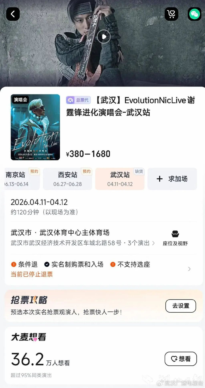据武汉交警发布的信息,预计每日有3万余名持票观众到场观演。门票价格分为看台380元、580元、780元、980元,内场1380元、1690元等多个档位,早在开演前就已售罄。某票务平台显示,超过36万名网友标记“想看”。