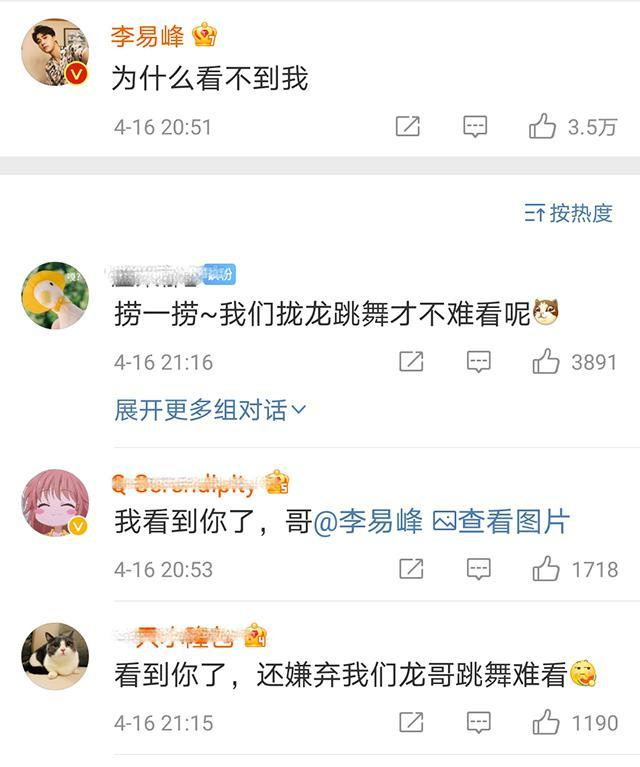在社交平台,李易峰也给朱一龙留言“为什么看不到我”,很多朱一龙粉丝留言,还在纠结李易峰说朱一龙跳舞不好看的话。