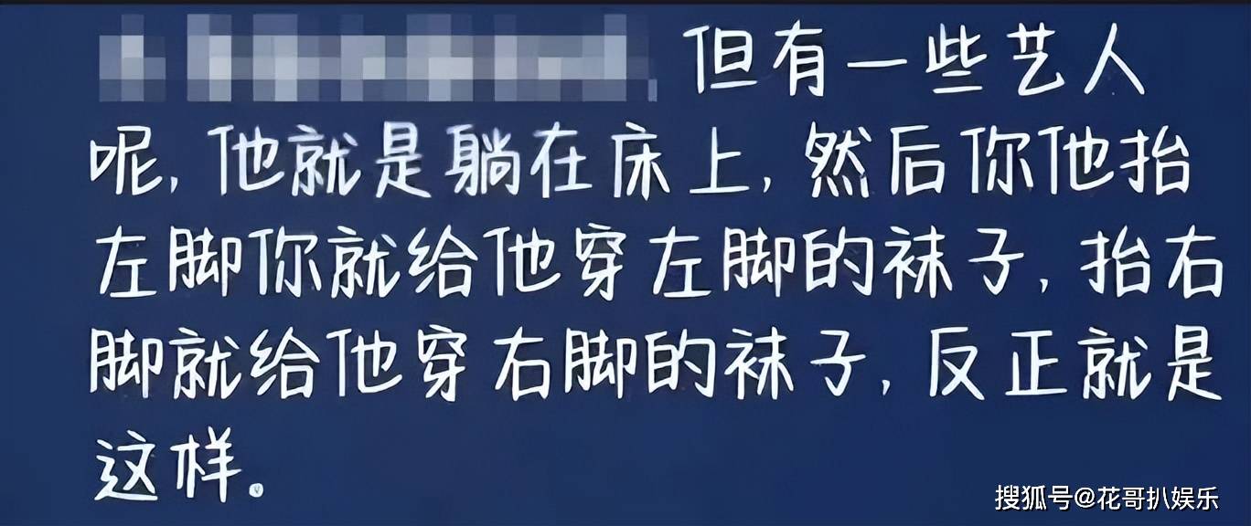 Q女士倒像是吃到了直播爆料的好处,突然话锋一转,从个人恩怨升级到了行业揭秘,开始曝光圈内猛料。她说,娱乐圈里有些艺人,真的是养尊处优到了令人发指的地步,简直肩不能扛手不能提。她说有些艺人就像巨婴一样,平时什么都不会,甚至连吃饭都需要人喂,穿袜子都需要工作人员一只一只地帮他穿好。