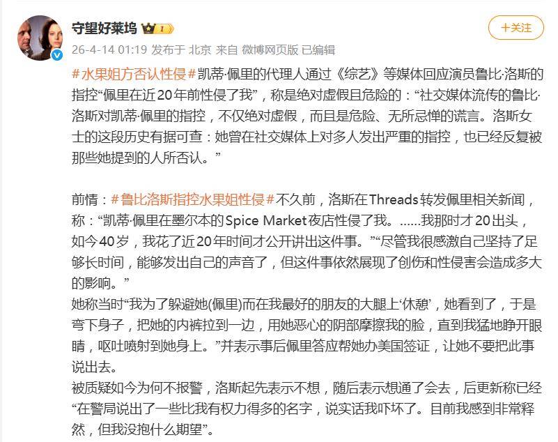 据4月13日晚间报道,娱乐圈被一桩近二十年前的旧案炸开了锅。曾出演《巨齿鲨》《生化危机:终章》的女演员鲁比·洛斯在社交平台公开发文,指控国际流行巨星“水果姐”凯蒂·佩里在她二十岁出头时对她实施性侵,并称自己已经报警。