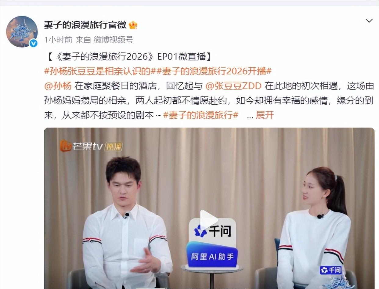 4月9号,《妻子的浪漫旅行2026》正式开播,节目刚上线就收获不少关注,相关话题很快登上热搜,参与节目的孙杨和张豆豆,在节目里分享了家庭近况,正式对外官宣两人已经迎来孩子,消息公开后,不少网友都觉得意外,也纷纷送上祝福。