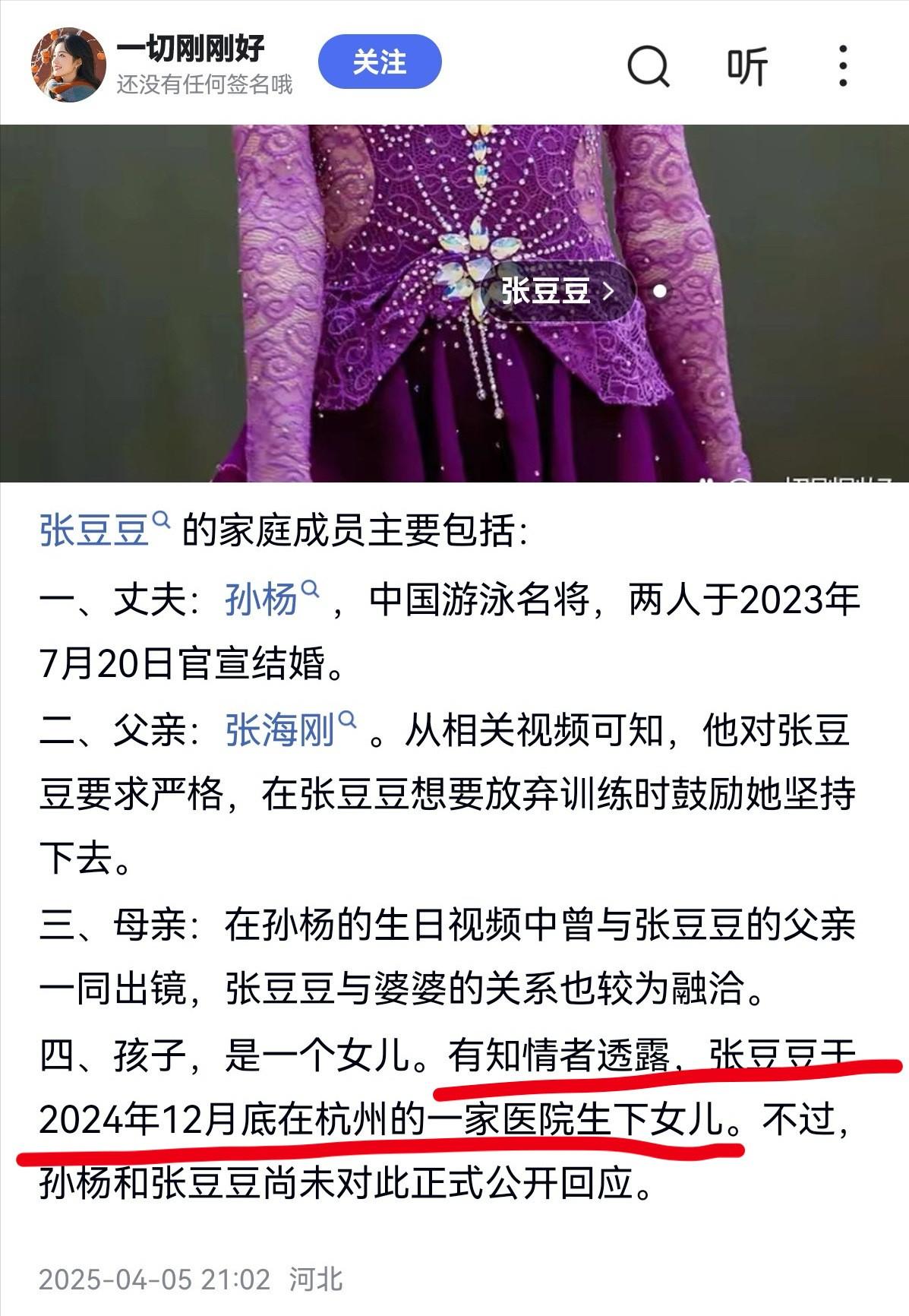 有知情人士透露过相关信息,张豆豆是在2024年12月底,在杭州的一家医院生下孩子,还有消息称孩子是女儿,不过这些消息都没有得到两人的正面回应,只能当作传闻。