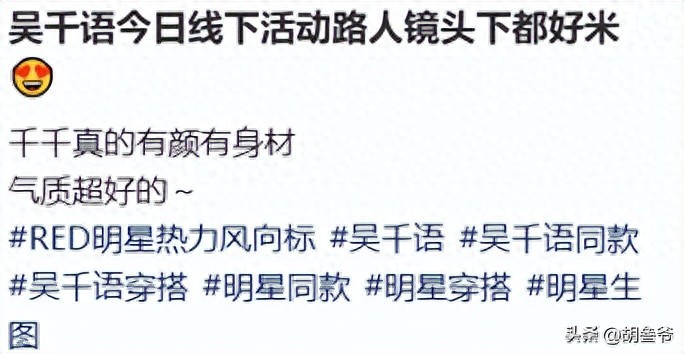从4月14日线下活动的争议就能看出来,吴千语现在的关注度依旧很高,不管是造型细节,还是身材状态,都能引发全网讨论。