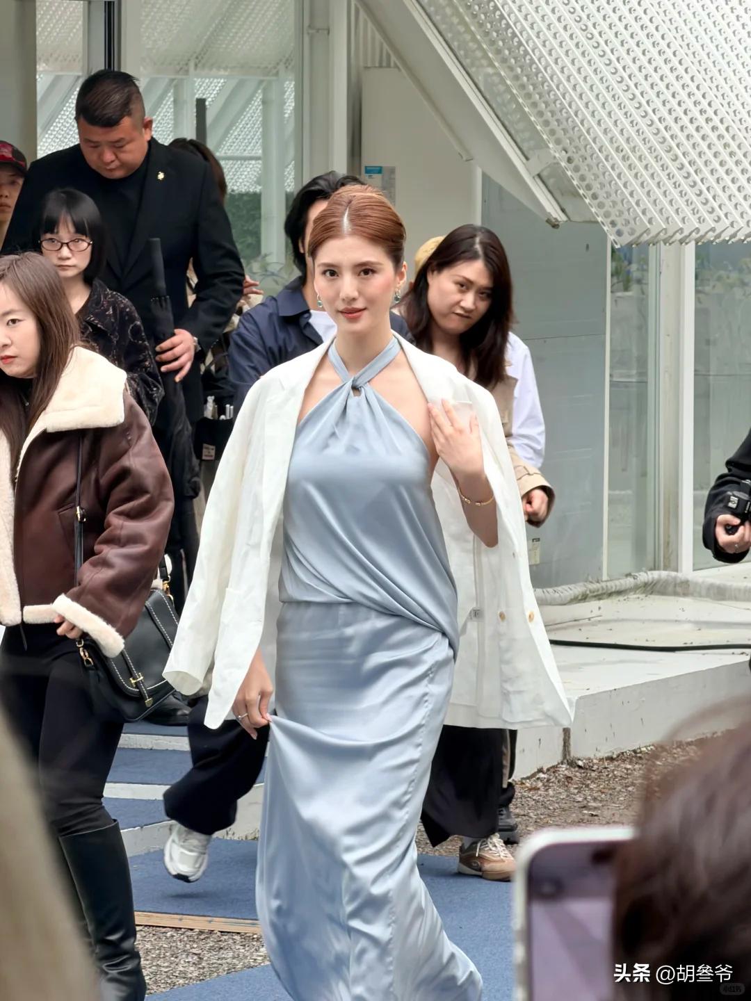 多位网友在短视频平台同步晒出现场实拍,蓝色挂脖丝绸长裙配上吴千语白皙皮肤,现场不少人直呼像从童话里走出来的公主。