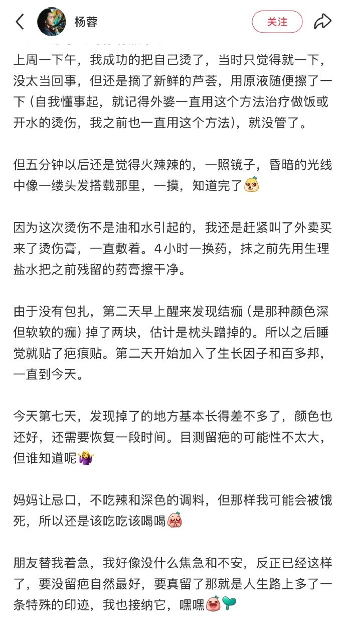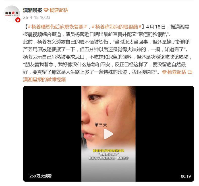 从意外烫伤到晒照恢复,杨蓉用短短数日完成了一次关于勇气与接纳的公开课。在这个对容貌近乎苛刻的时代,她的这份“酷”,或许比任何完美的容颜都更有力量。