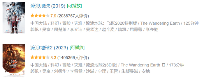 作为中国最成功的科幻电影系列,《流浪地球》第一部于2019年大年初一上映,斩获近47亿元票房成为当年春节档冠军,豆瓣评分7.9分,超200万人打分。《流浪地球2》2023年大年初一上映,同档期惜败于张艺谋的《满江红》,拿到超40亿元票房,豆瓣评分8.3,超140万人打分。系列总票房已近90亿元。