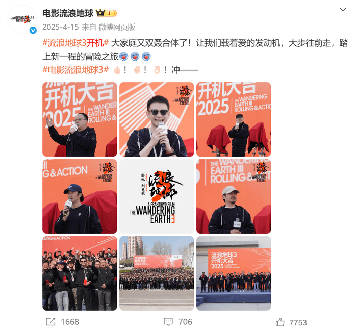 在网友们的翘首期盼和不断催更下,2025年4月,《流浪地球3》宣布开机。新演员阵容也曝光,除了吴京、刘德华等“老面孔”,还有如沈腾、马丽等新加入。
